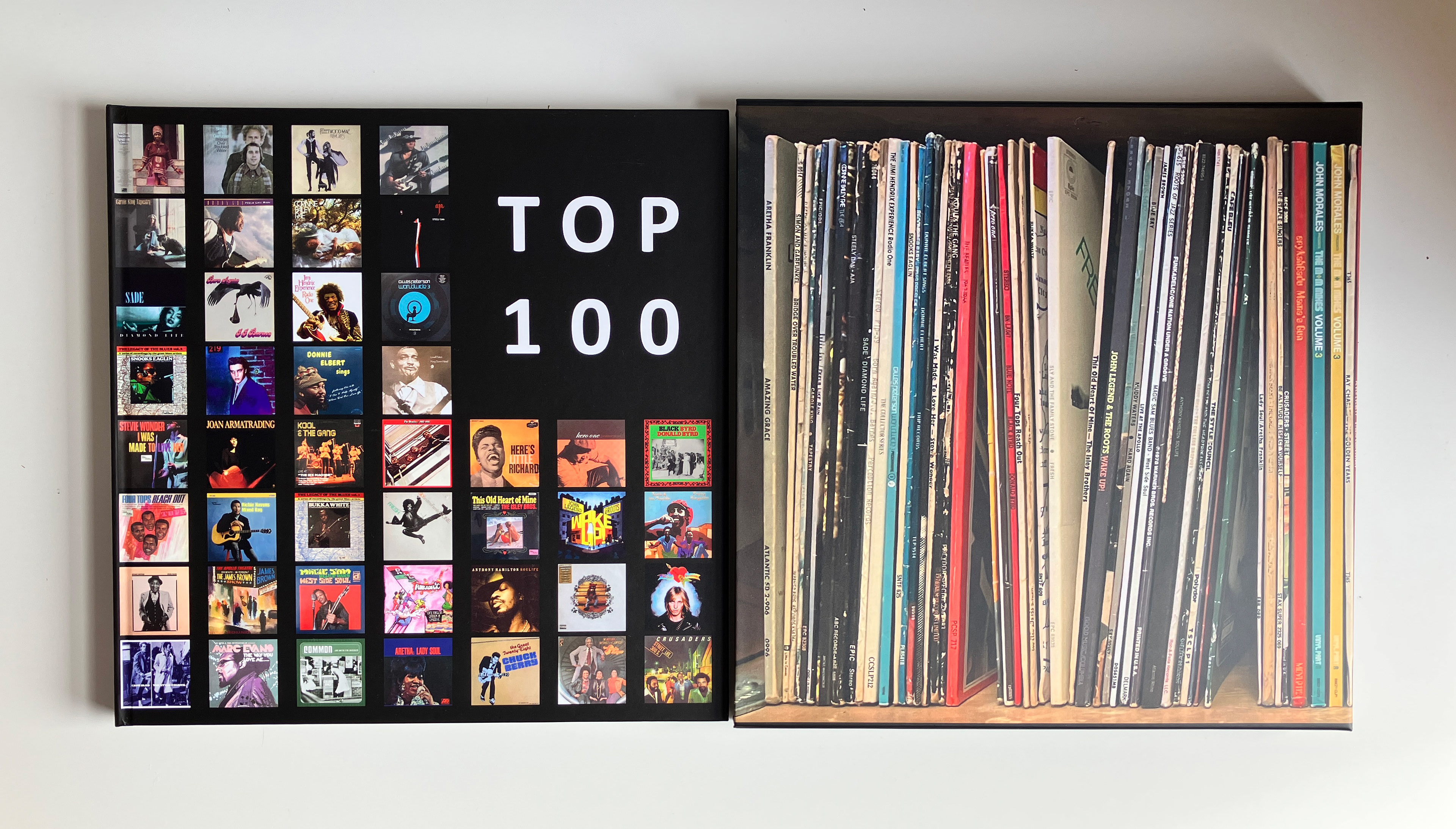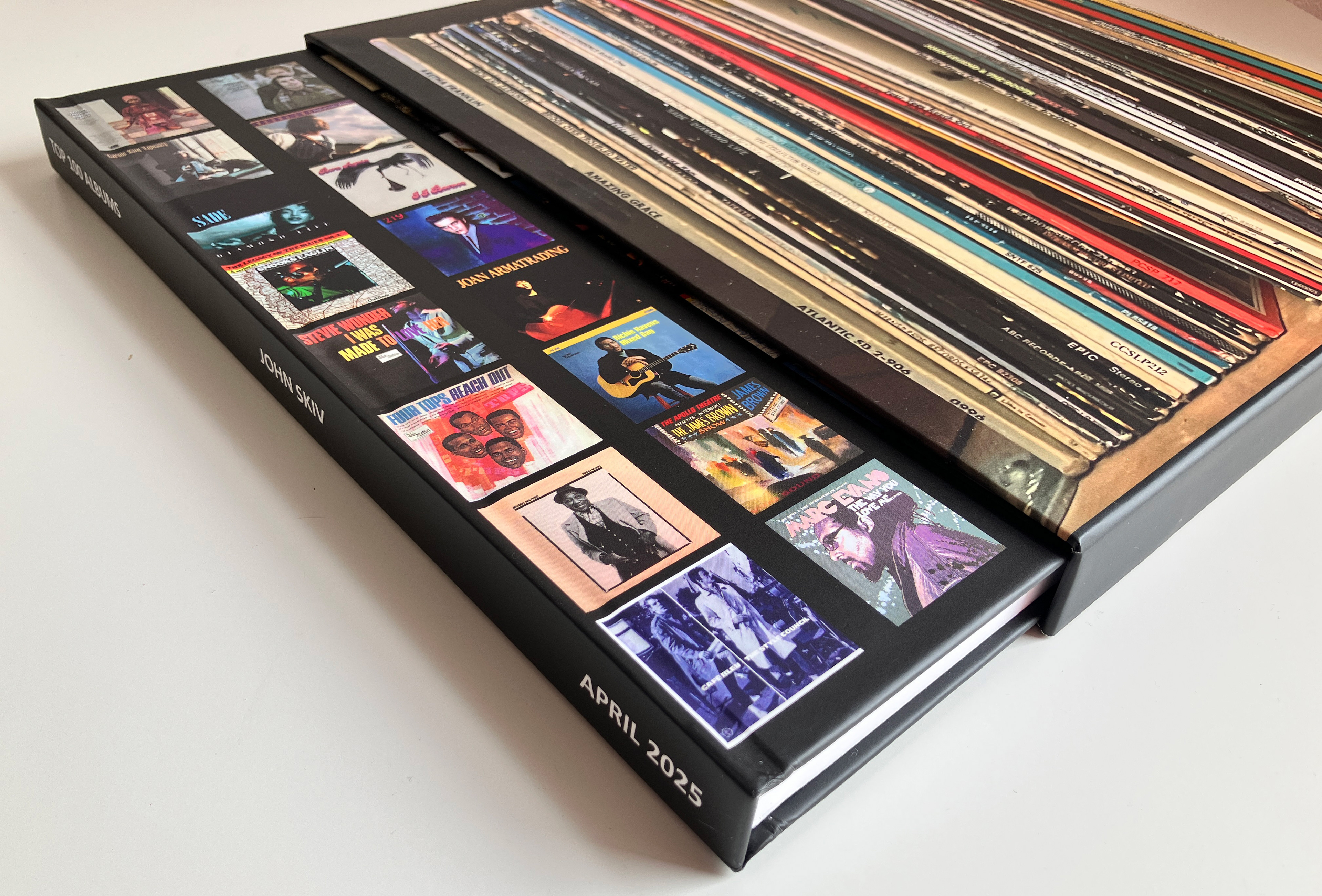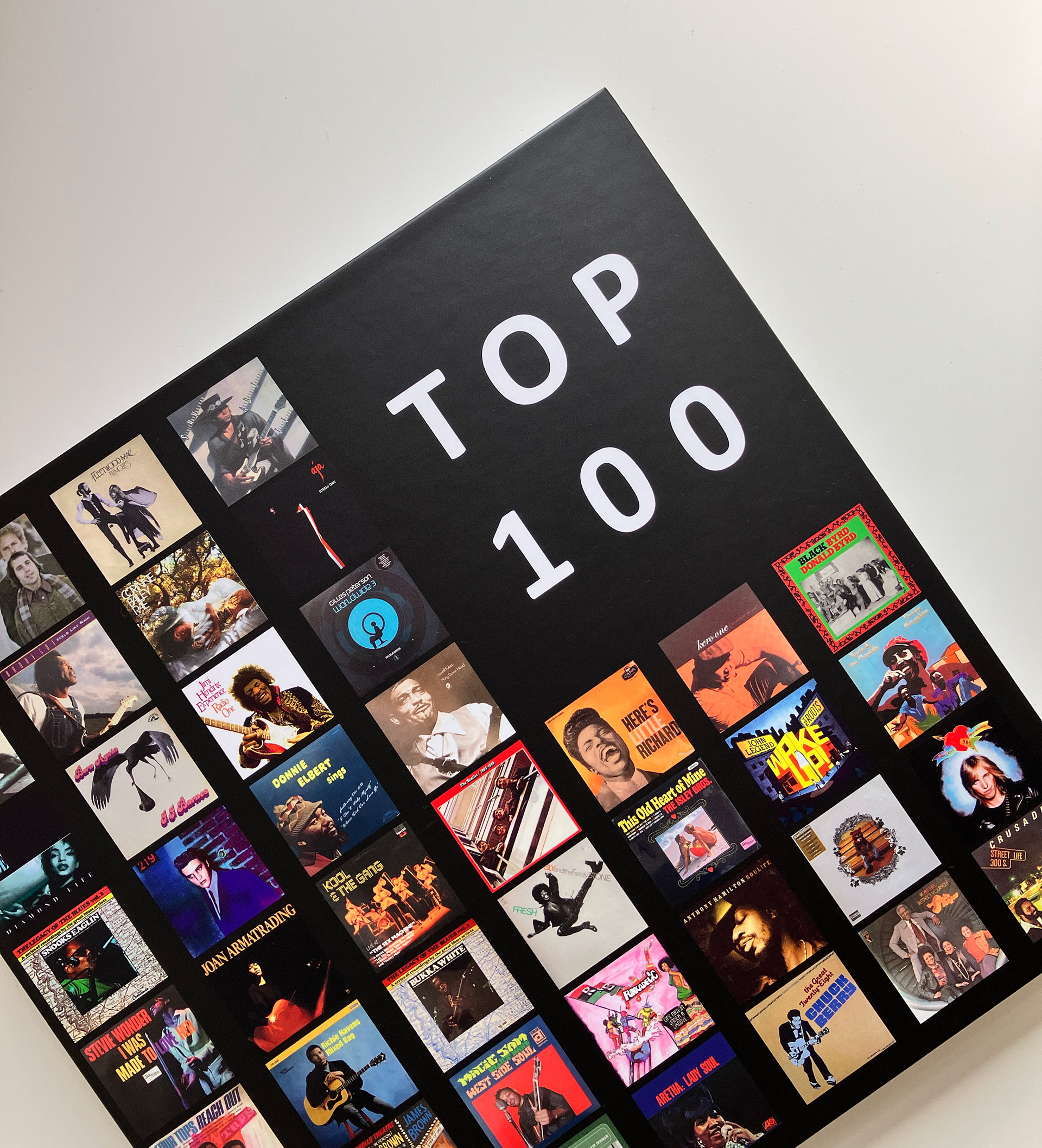 Brief: My client had identified their favourite 100 albums and wanted to present these in a coffee table book. Design and produce the book using the assets provided, delivering 25 copies with a printed binder.