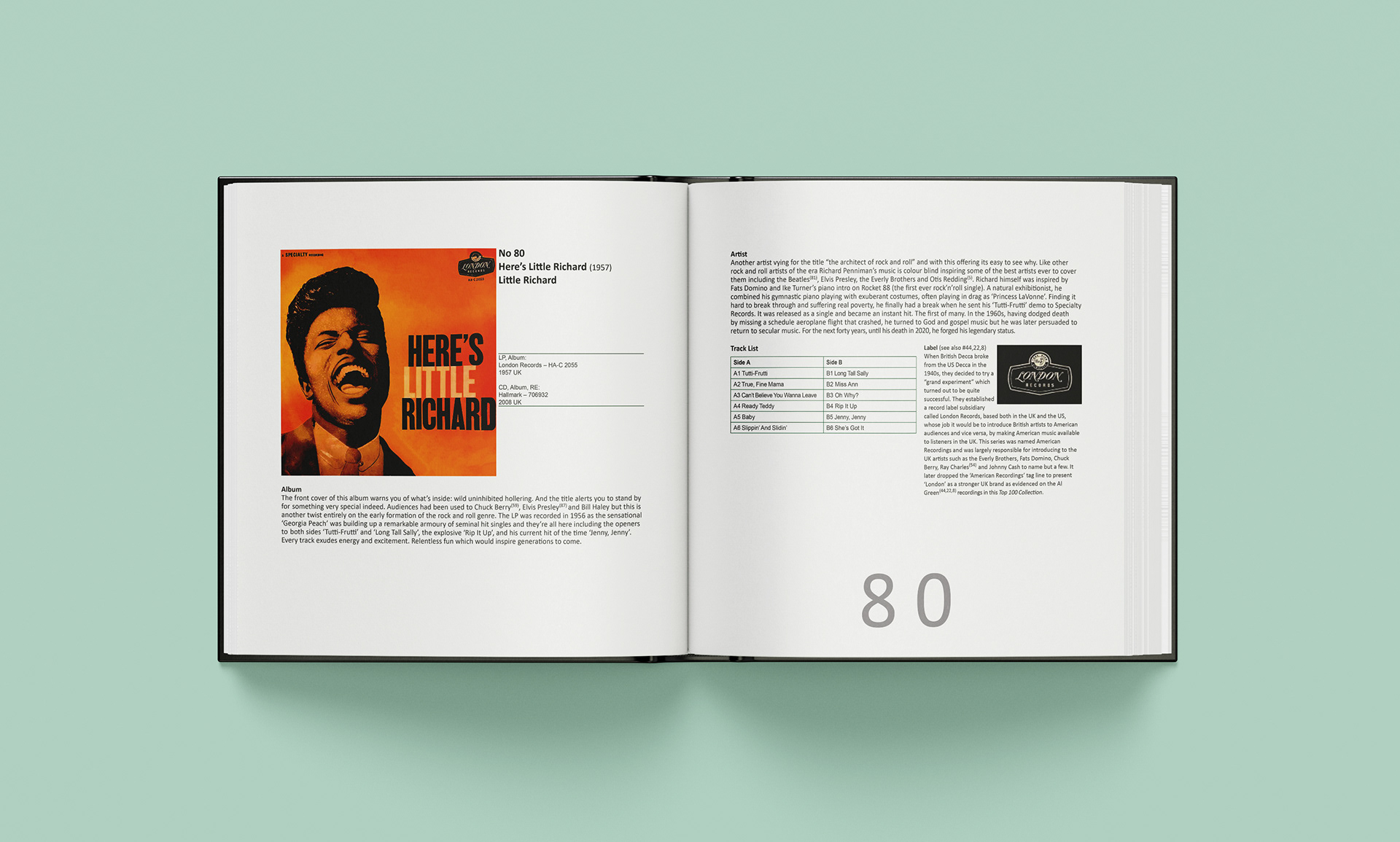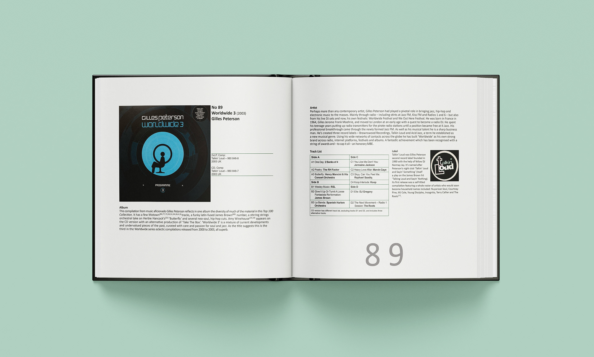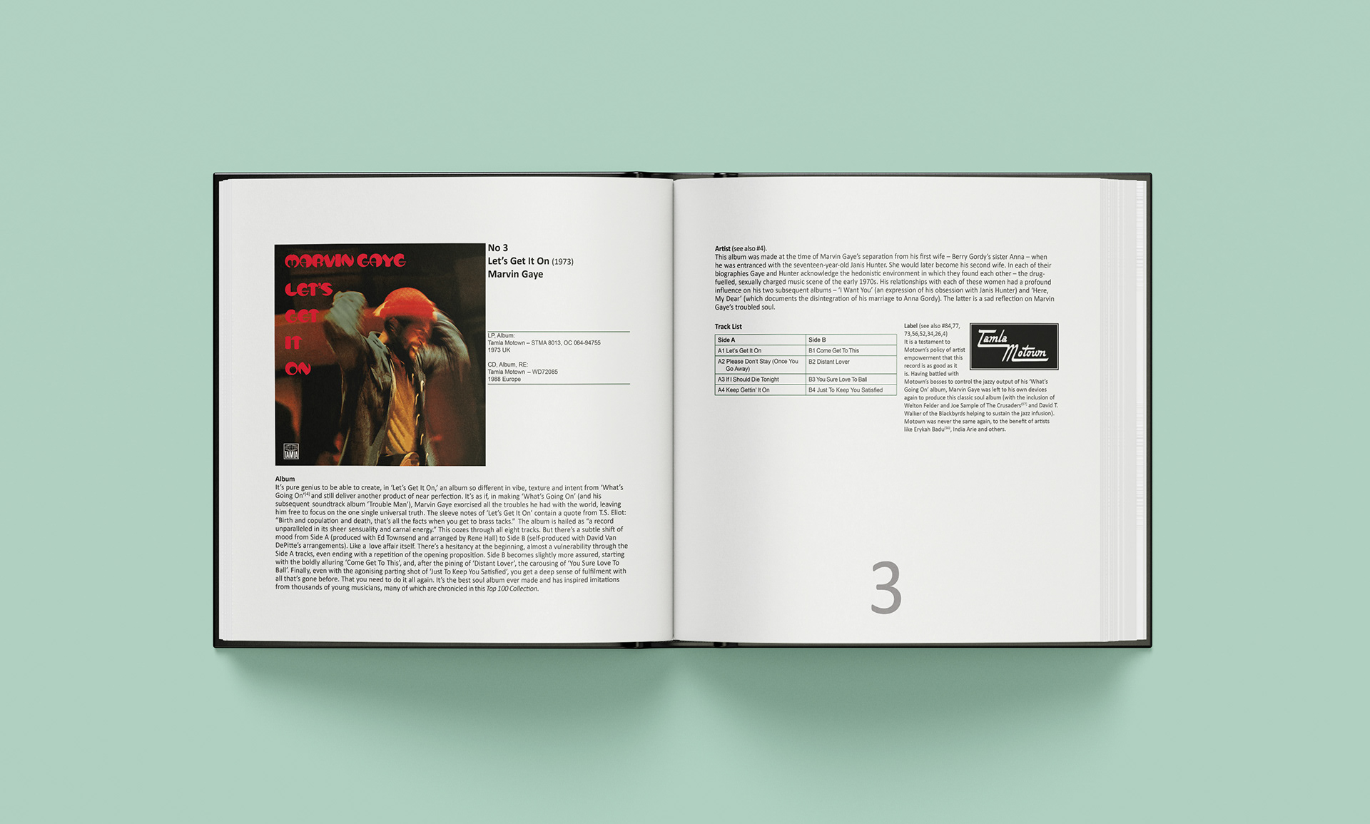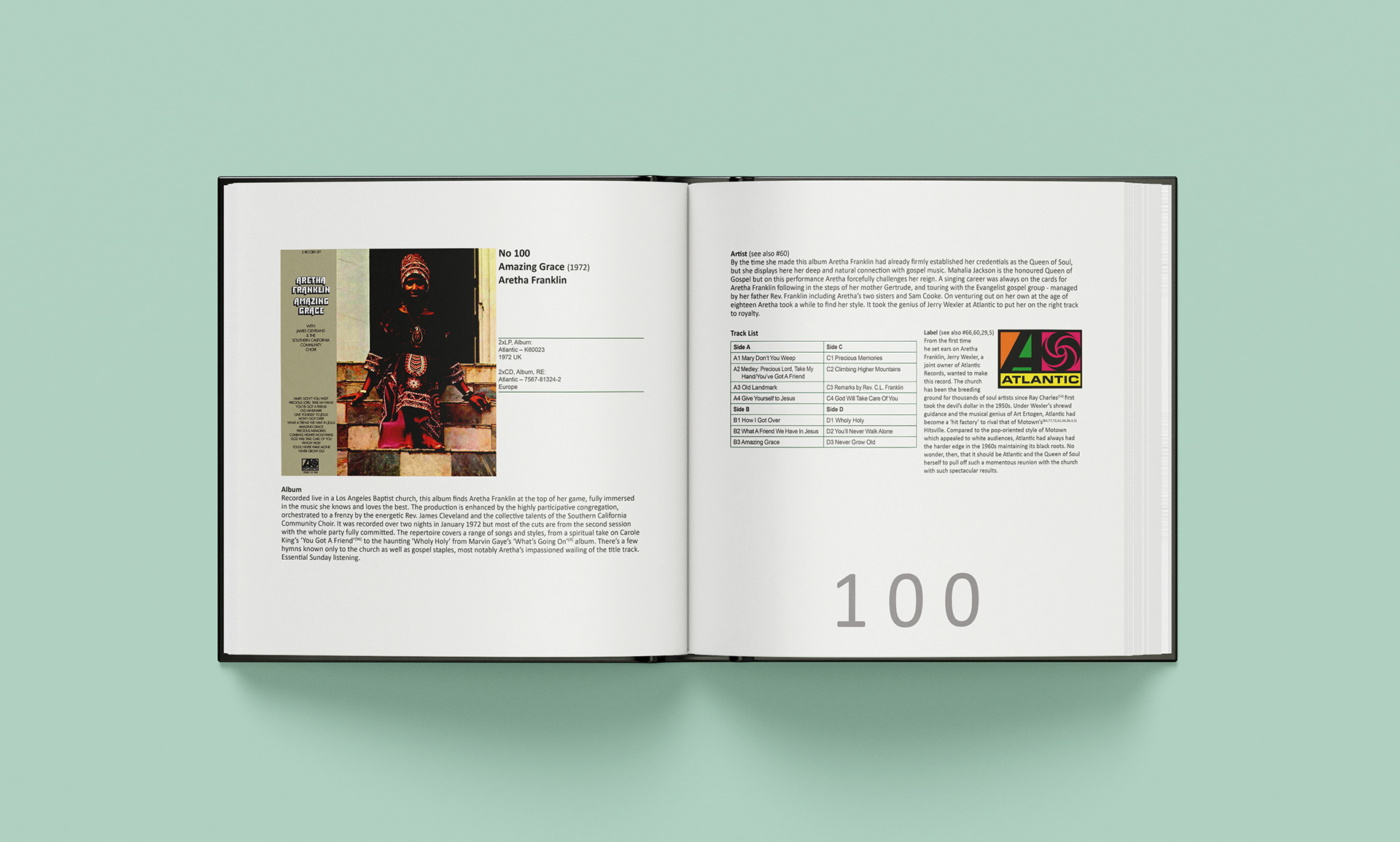 Format: Each album needed to be presented across a double page spread, with all information visible in one view. The book was to be bound with 200+ pages with a hard cover. The front and back covers were to feature colour images of all the albums laid out in the order 100 to 1. The binder was to feature a photograph of all 100 albums stacked on a shelf.