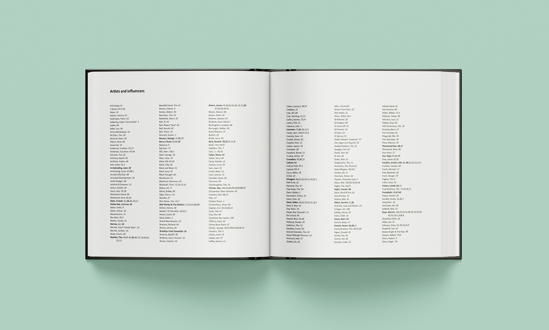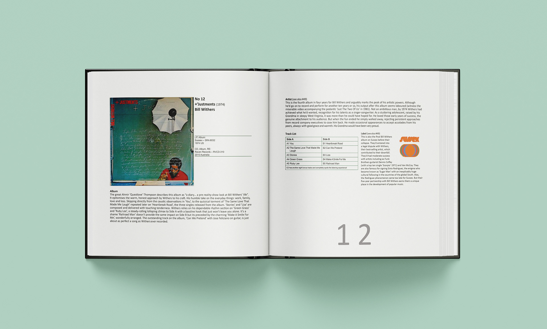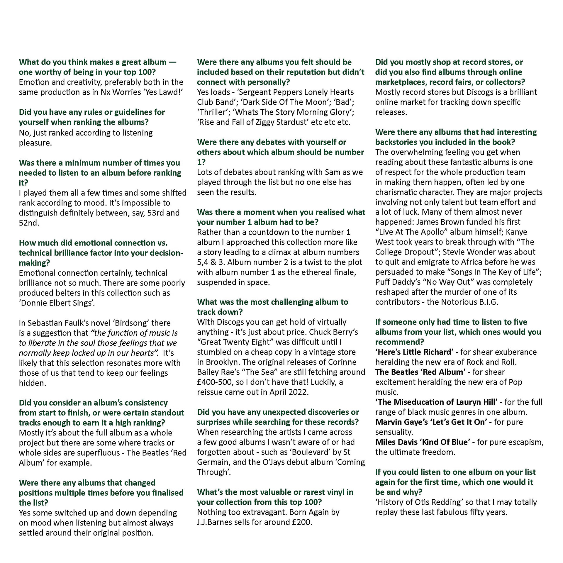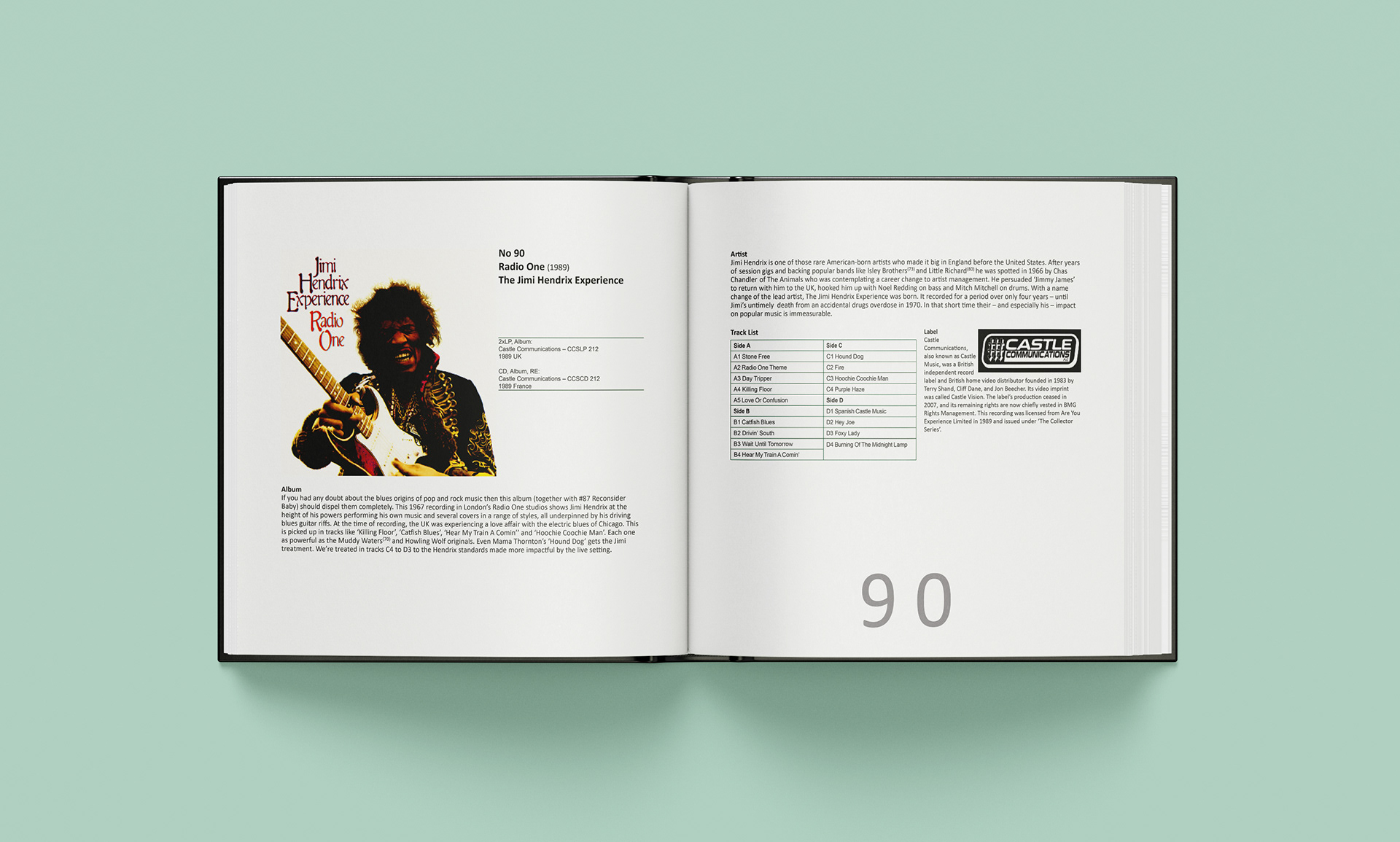 Format: Each album needed to be presented across a double page spread, with all information visible in one view. The book was to be bound with 200+ pages with a hard cover. The front and back covers were to feature colour images of all the albums laid out in the order 100 to 1. The binder was to feature a photograph of all 100 albums stacked on a shelf.
