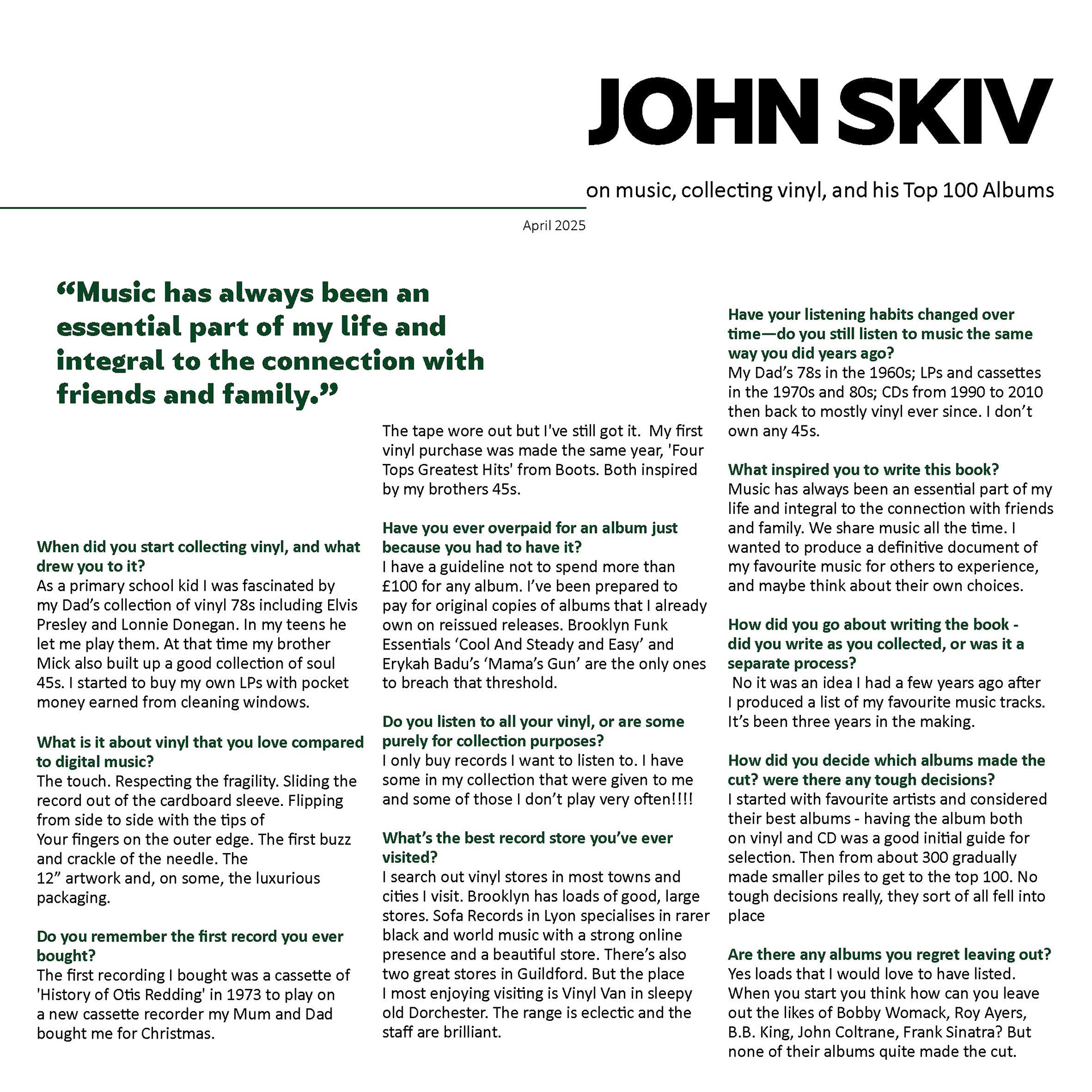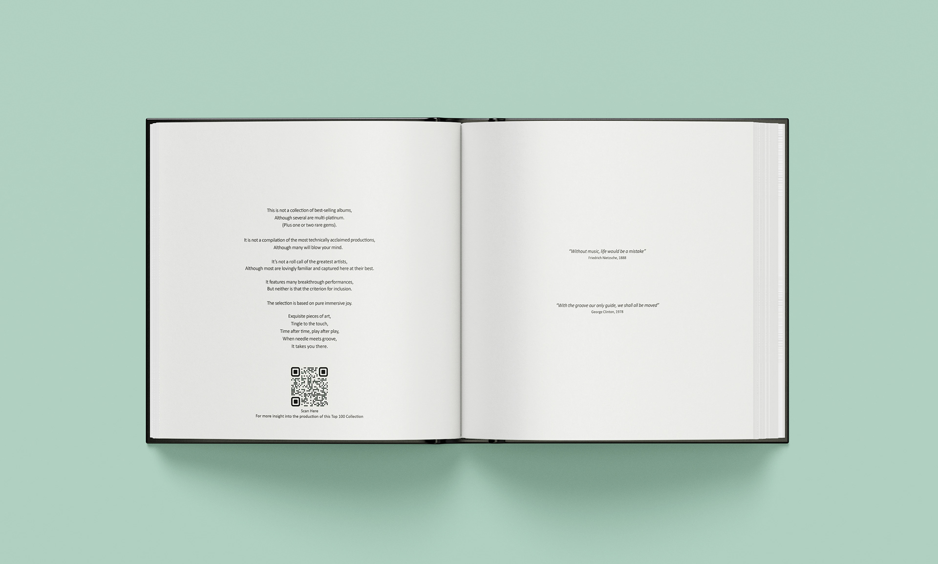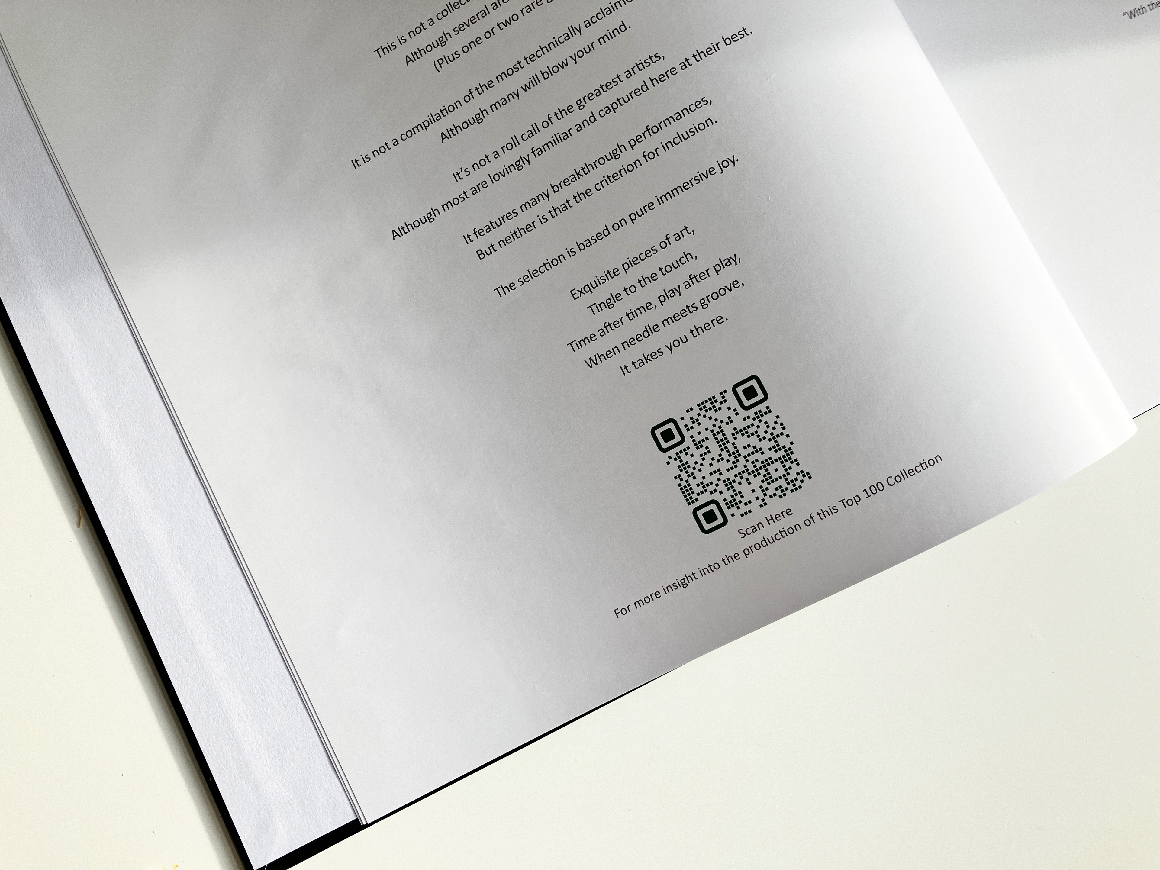Another challenge I faced was how to share the client’s story without overwhelming the design with too much text. I suggested including the story behind the collection and the process for ranking the albums. To balance storytelling with design clarity, a discreet QR code was placed at the beginning of the book which linked to a written interview.
